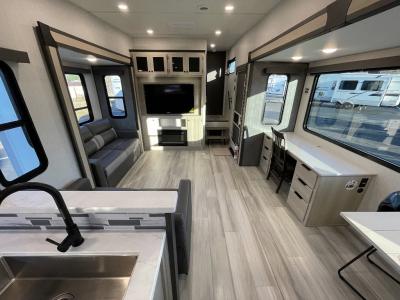 Cook like a chef worthy of a Michelin star in this amazing fifth wheel! Inside, you'll find a spacious rear kitchen, complete with a pantry, a 12V refrigerator ideal for keeping your fruits and vegetables fresh, overhead cabinets, and a sprawling countertop for all your cooking and dining times. The high-top table and chairs provide the perfect place to enjoy meals with family and friends. The living room is a cozy place featuring comfortable theater seating, a tri-fold sofa, a cozy fireplace, an entertainment center, and a convenient desk for staying productive on the go. The full bathroom is also a great place to freshen up, complete with a linen closet and all the amenities you need to take a bath and feel at home. With a spacious shower and plenty of storage, you'll have everything you need to start your day off right. The perfect place to rest and recharge after a long day of adventure is the front bedroom which boasts a comfortable king bed, dresser, walk-in wardrobe with washer and dryer prep, for keeping all your favorite belongings clean and organized on the road. Outside, you'll appreciate the pass-through storage for all your gear and toys, as well as the two awnings (15' and 11') ideal for creating unforgettable memories outside without worrying about the weather.