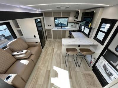 This is the perfect couple's trailer for weekend trips to the campground. The front kitchen includes ample counter space, including a bar top with two stools. You can relax on the theater seat within the slide out here, and the pantry and 12V refrigerator is close by so you can grab a snack. A master bedroom includes a custom king bed slide out, a panoramic window, an ottoman, plus a dresser with a fireplace to make your space cozy. The full rear bath includes dual bath sinks, a walk-in shower with a skylight, plus washer and dryer connections if you want to add those appliances.