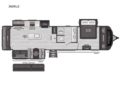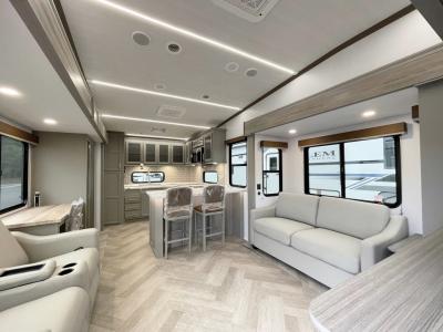 You will find residential style seamless marbled countertops, Dyna Span marine grade decking, residential style screwed and glued cabinetry, and designer upholstered window valances to make you feel right at home. The MaxTurn technology with Road Armor will make for smooth towing and the automotive-grade painted fiberglass front cap includes KeyShield protection for added convenience.