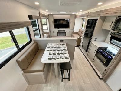 Head for the hills, lake, or woods in this spacious travel trailer. Once your gear is unloaded from the pass-through storage, set up the 19' power awning with LED lights and relax with a cold drink. Once you head inside you can make lunch on the three burner range and dine at the dinette that includes two chairs and bench seating. The rear living area includes a rear entertainment center with an LED TV and a 34" fireplace for a cozy atmosphere. There is also theater seating here and two 70" sofas within the dual opposing slides where your guests can sleep. And you will enjoy the front private bedroom with a king bed all to yourselves!