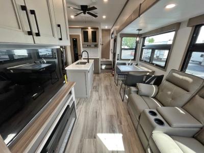 All of your friends and family can camp together in this fifth wheel! It features a rear private bunkhouse with a bunk above a hide-a-bed sofa, a full bathroom with a 30" x 36" shower, and an entertainment center with wardrobes on either side. There is also a folding bunk and a bunk over the outside kitchen. Across from the hide-a-bed sofa is an entertainment center with a 40" fireplace and a 43" smart TV to watch your favorite movies at night. The kitchen island will allow you to cook with ease and you can prepare your best meals with the four burner range with a 24" oven. The second bathroom has a residential shower with a seat and a linen closet to keep your towel close. Enjoy a good night's rest on the king bed slide in the front private bedroom which also has a dresser and a front wardrobe with washer and dryer prep!