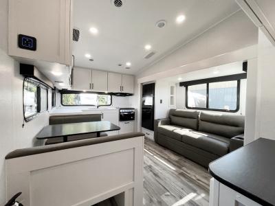Pack your bags and head to the campground in this rear kitchen fifth wheel! There is ample counter space to prep meals, along with a range and over-the-range microwave. The booth dinette provides a place to dine together, and the tri-fold sofa will be the perfect place to relax in the evenings. There is also a Smart TV across from the sofa to make movie nights complete! The centrally located full bath includes a 30" x 36" shower with a skylight to give you more head room as you get ready each day, and the front private bedroom with a wardrobe slide gives you more space to get dressed in the morning. There is also a queen bed here, dual nightstands, TV prep, and additional storage for shoes and clothes!
