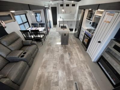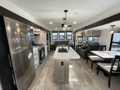 Get ready to enjoy your destination for a weekend or even longer in comfort with the front living and kitchen combined area. The sofa and booth dinette offer relaxing and dining space as well as sleeping space when needed. There are two recliners you are sure to love, as well as a fireplace to make it feel more like home. There is a kitchen island to prepare and serve meals from and wash the dishes. The kitchen offers full amenities including a stainless steel refrigerator and plenty of storage. You will surely enjoy the natural lighting from the patio door, and the second entry/exit is located in the rear private bedroom where you can sleep like a royalty on the king bed. There is also a closet with the option to add washer and dryer prep if you choose!
