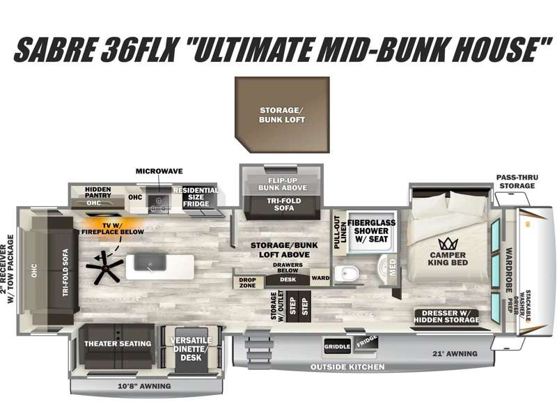 There is much to love in this fifth wheel! Starting with the second bedroom which has a slide that houses a flip-up bunk above a tri-fold sofa across from a desk with drawers, a drop zone, and a wardrobe, plus above all of that is a storage/bunk loft. The rear living area includes a tri-fold sofa, a TV with a hidden pantry behind, and theater seating for two making this space another area at night for guests. In the morning, you can prepare breakfast on the kitchen island, then dine together at the versatile dinette/desk. The full bath will allow you to stay clean throughout your trip, and you'll feel right at home in the front private bedroom with a camper king bed, a dresser, and front wardrobe. Outside, a kitchen and two power awnings create an inviting space!