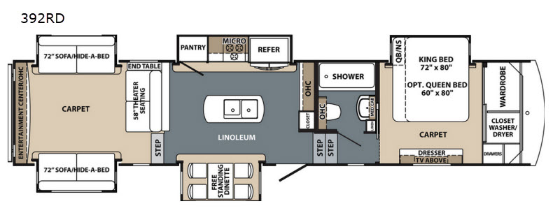 Come see just how fun and easy camping can be with this Cardinal Explorer 392RD in tow! For the kitchen amenities you will find an island with a double sink, and you can store your food at the large pantry. When you want to relax and visit with your family then come do so in this spacious rear living area. Here you will find dual opposing slide outs with two sofas plus theater seating along the interior wall. You can enjoy watching TV at the entertainment center. When you are ready for a great night's sleep, then come retreat to the front bedroom where you will find a king bed. There is plenty of storage in this room with the dresser and the wardrobe. In the evening plan to enjoy your time outside under the 16' electric awning with LED lights.